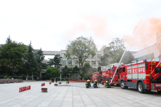 消防演练环节中,随着急促的警铃声响起,全体新生在宿管和承训教官的正确指引下,按照火场逃生的规范及动作要领,快速、有序的全员疏散到室外空旷地带。结束后,官渡区消防救援大队的教员首先为全体师生开展了火场灭火、救援实操模拟演练。其次,深入讲解了手提式干粉灭火器、室内消火栓箱、灭火毯、防毒面具等消防设施器材的使用方式,以及日常生活中如何防范消防安全隐患并正确的处置突发情况。最后,细致指导学生使用灭火器开展灭火实操。