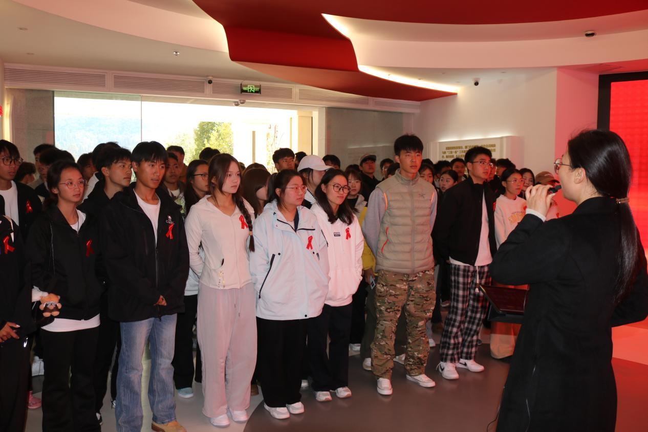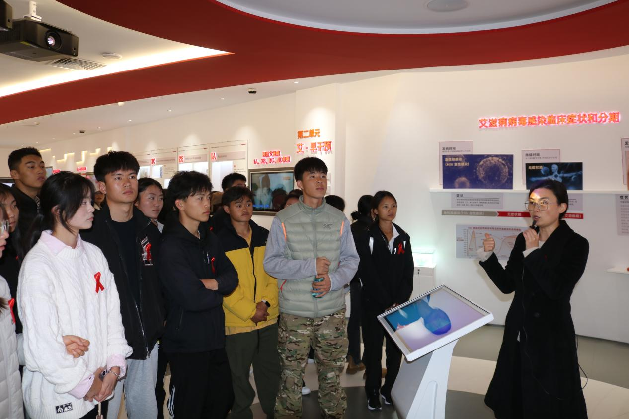 在基地讲解员的引导下,师生们系统参观了基地的展陈内容。讲解员借助丰富的数据、真实的案例与专业的分析,通过互动式、体验式的教学方法,向同学们全面介绍了艾滋病的传播途径、预防措施、治疗现状以及社会关怀等多方面知识。活动突破了传统课堂教育的模式,以直观、沉浸的参观体验,加深了师生对艾滋病防治的理解。