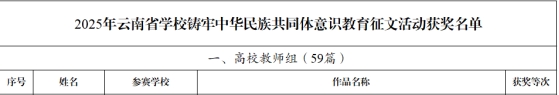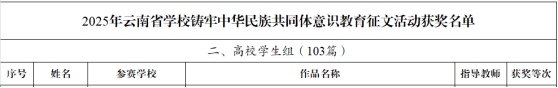 近日,云南省教育厅、云南省民族宗教事务委员会公布2025年度云南省学校铸牢中华民族共同体意识教育征文活动获奖名单。我校教师陈洁的征文《体育院校思政课程和课程思政“双轮驱动”铸牢中华民族共同体意识》获高校教师组一等奖;竞技体育学院2021级运动训练专业五年一贯制学生贾荣康的征文《接力棒上的共同体——从课堂到山乡的体育足迹》获高校学生组三等奖。