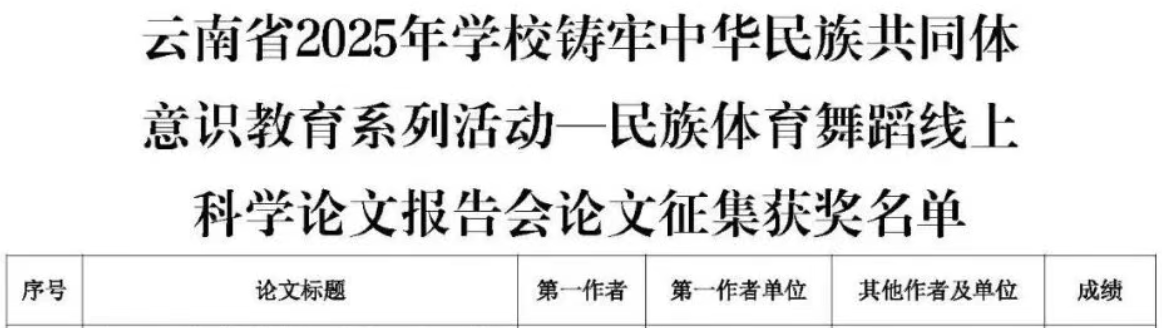 在民族体育舞蹈线上教学成果竞赛中,由和雪英老师指导的参赛作品“大学傣族华尔兹”和“大学佤族恰恰恰”分获二等奖和三等奖;在民族体育舞蹈线上科学论文报告会论文征集中,和雪英、杨丽蓉老师的参评论文《新文科“跨学科+文化传承”双导向:民族体育舞蹈创编助力铸牢中华民族共同体意识研究——基于藏族舞与牛仔舞的探索》获二等奖,叶超、和雪英老师的参评论文《新时代云南高校民族体育舞蹈文化建设的守正创新研究》获三等奖。