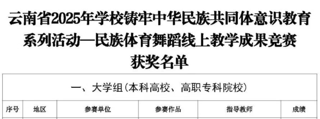 近日,云南省教育厅公布2025年学校铸牢中华民族共同体意识教育系列活动—民族体育舞蹈线上教学和竞赛活动获奖名单,我校师生获二等奖2项、三等奖2项,展现了学校推进民族团结进步教育和民族文化传承创新的丰硕成果。