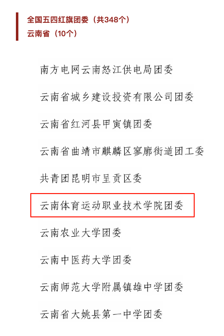 近日,共青团中央印发《关于表彰全国五四红旗团委(团支部)、全国优秀共青团员、全国优秀共青团干部的决定》,云南体育运动职业技术学院团委凭借扎实的工作成效、鲜明的工作特色和突出的育人成果,被授予 “全国五四红旗团委” 荣誉称号。全国五四红旗团委(团支部)是共青团中央授予县级团委和基层团组织的团内最高荣誉,此次获奖不仅是对学校共青团工作的充分肯定,也是全校团员青年共同努力的集中体现。