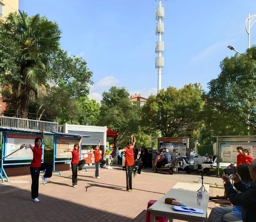 活动现场,校武术队的同学们率先带来太极拳、长拳等精彩节目展演。队员们招式刚柔并济、舒展有力,充分展现了中华传统武术的独特魅力与青年学子的昂扬风貌,赢得现场居民阵阵掌声。