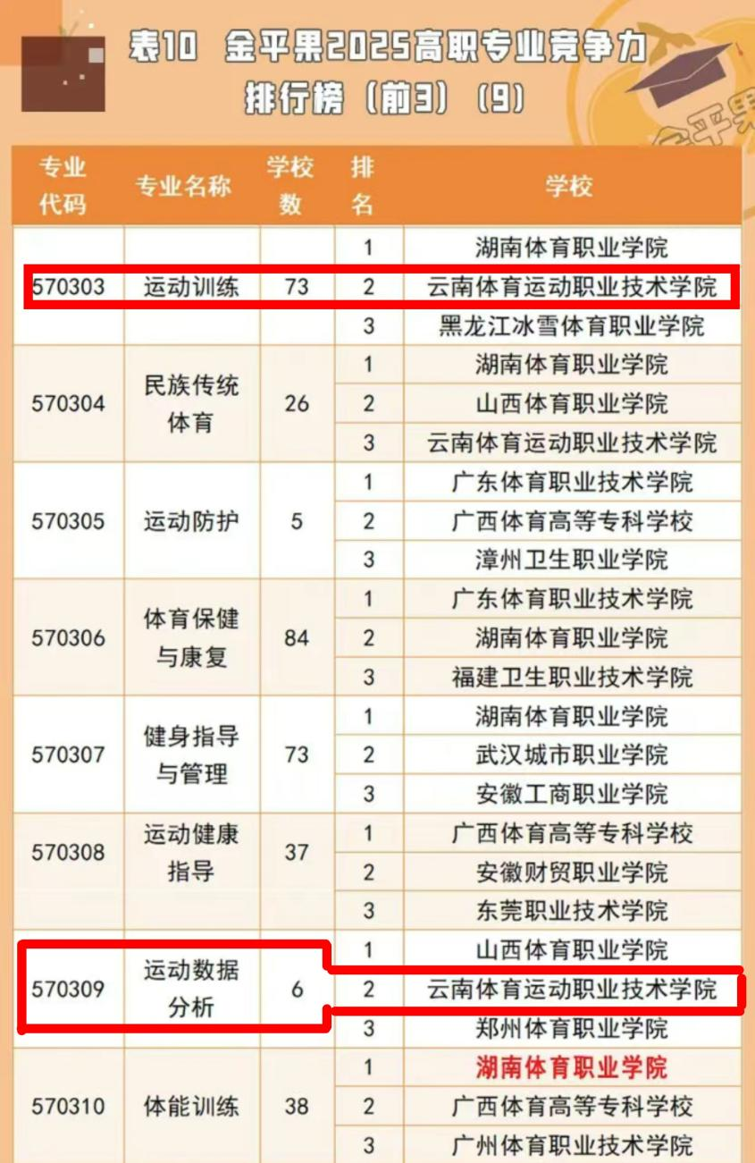 学院坚持“体教融合、学训一体”,推动专业建设与人才培养质量跃升。运动训练专业在2024、2025年位列“金平果”高职专业竞争力全国第二,运动数据分析专业在2025年位列同榜单全国第二。2023至2025年,学院持续参与“体育美育浸润行动计划”,覆盖千余名乡村学生。专升本与应征入伍比例明显提高,学院获评学校“就业创业先进集体”。