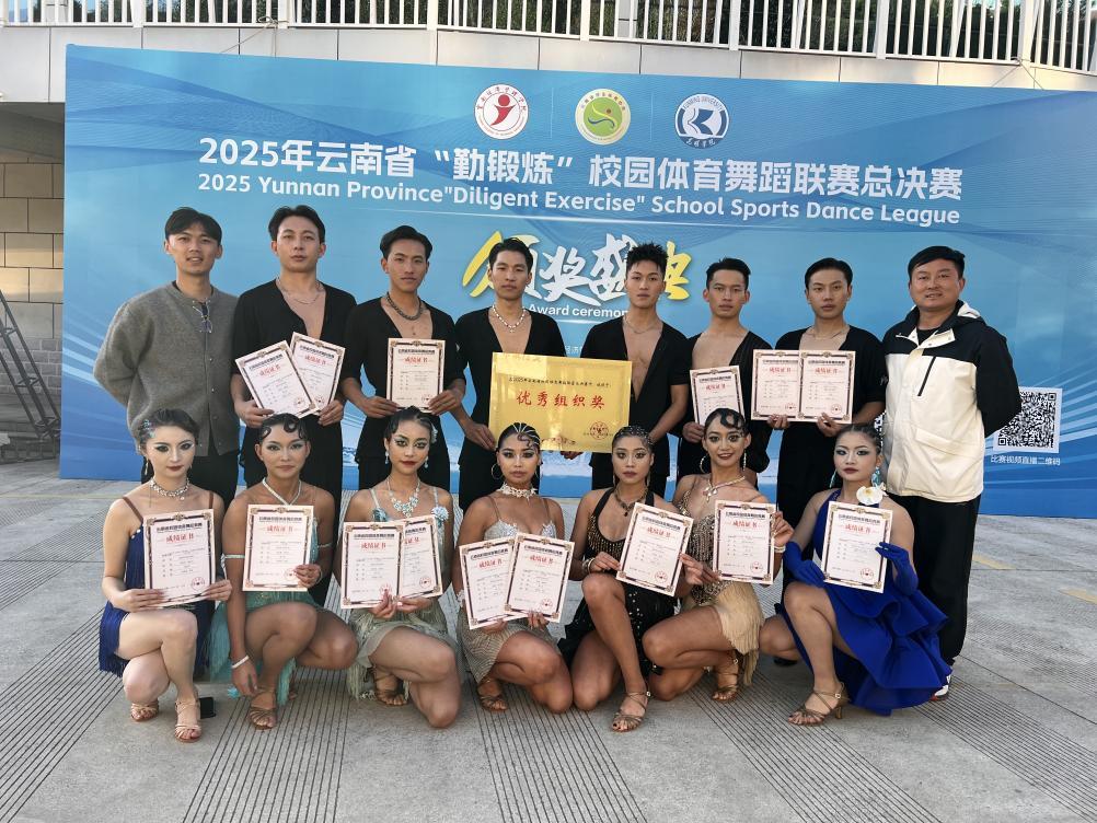 2025年11月28日至12月1日,云南省“勤锻炼”校园体育舞蹈联赛总决赛在云南经济管理学院举行。经过激烈角逐,我校体育舞蹈队凭借精湛技艺和出色表现,从全省209支参赛队伍、2500余名选手中脱颖而出,以优异成绩斩获团体总分第一名。