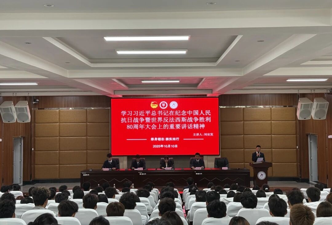 校学生会主席团成员刘安发同学带领所有参会人员学习习近平总书记在纪念中国人民抗日战争暨世界反法西斯战争胜利80周年大会上的重要讲话精神,强调历史启迪未来,要传承和弘扬伟大抗战精神。呼吁我们要铭记历史、缅怀先烈、珍爱和平、开创未来,为实现中华民族伟大复兴的中国梦而努力奋斗!