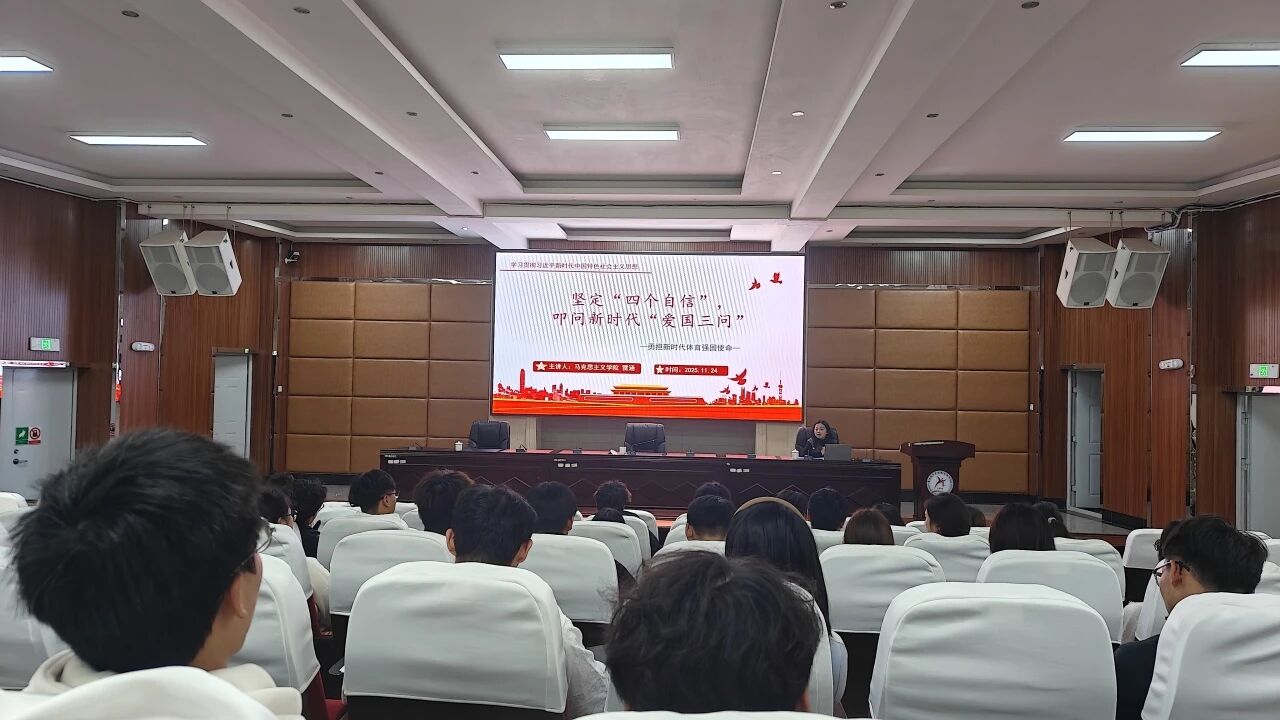 开班仪式结束后,马克思主义学院雷涵老师围绕“学习贯彻习近平新时代中国特色社会主义思想”开展第一堂授课。她首先以“四个自信”作为开题,阐述其与强国复兴的内在关联;结合体育发展的实践成果,印证“四个自信”的现实价值;最后发出行动号召,鼓励青年以实际行动回应“爱国三问”,用青春力量践行责任与担当。