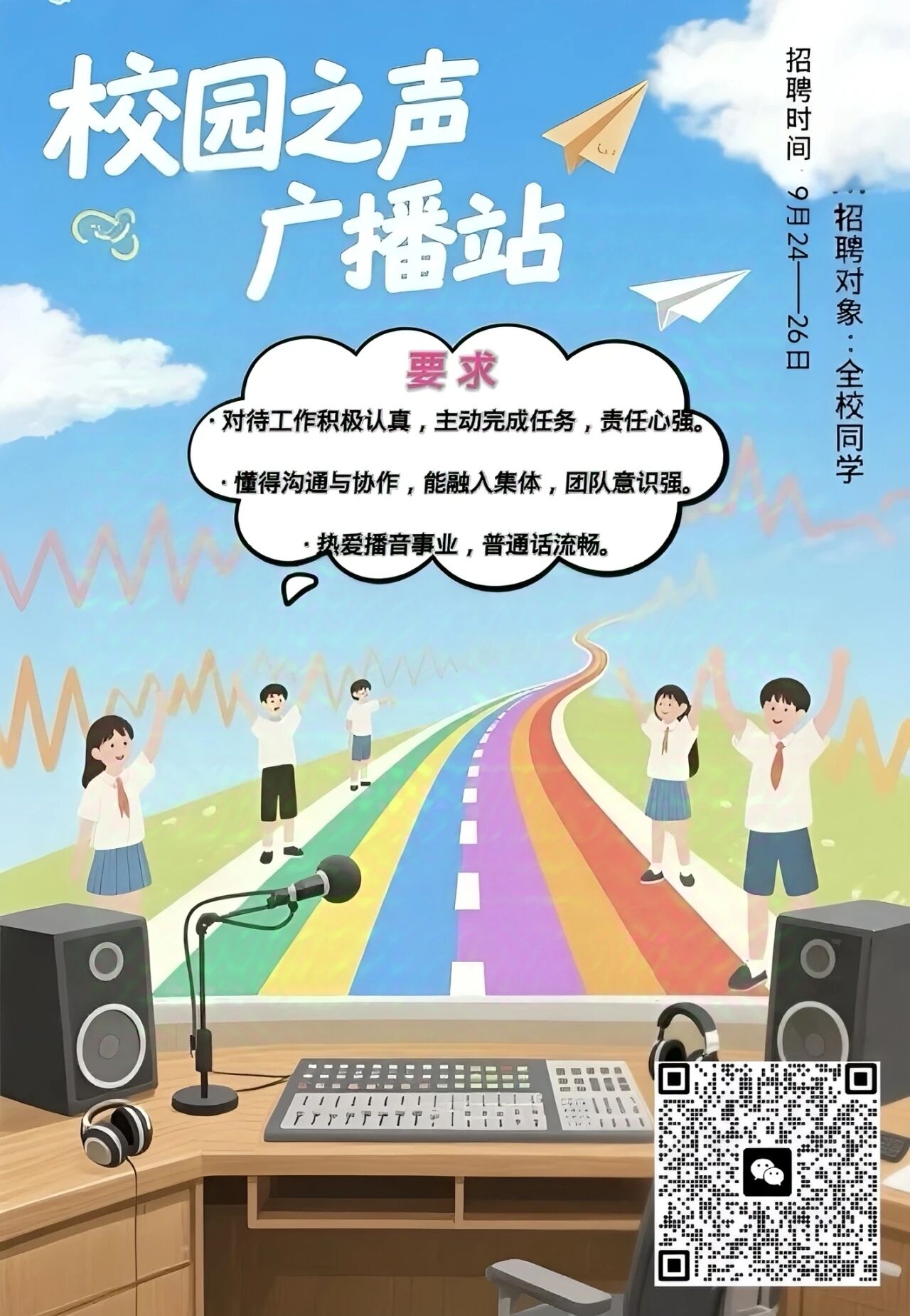 一段声音,能温暖整个校园;一份热爱,能点亮青春旅程!“校园之声”广播站招新等你赴约,不管你想尝试播音、主持还是编稿,快来报名,让我们并肩开启声音新旅程!