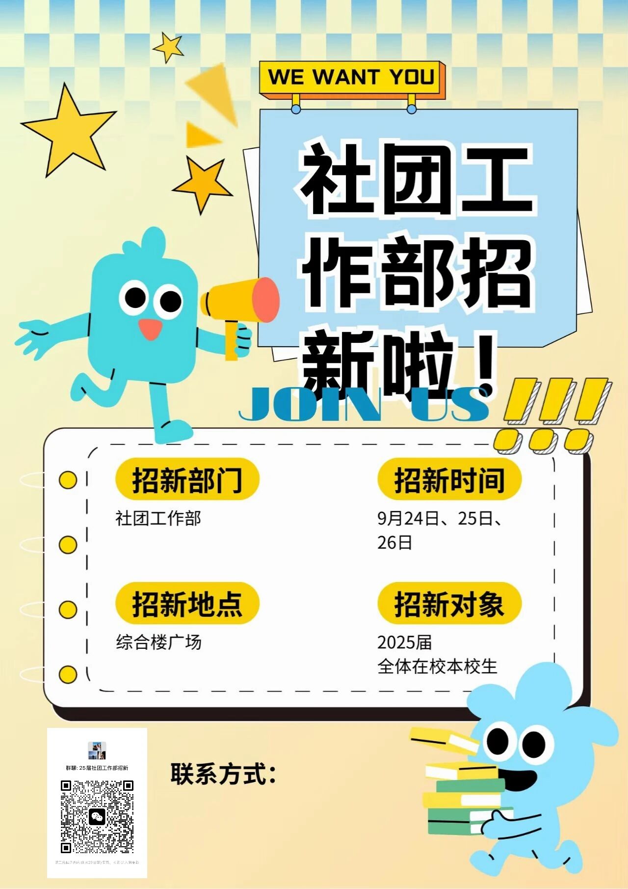 来喽!来喽!校团委社团工作部招新啦,在这里,你将执笔绘就社团风采,以心联结校园经纬,快来和我们一起,在社团的广阔天地里,书写属于你的成长篇章!