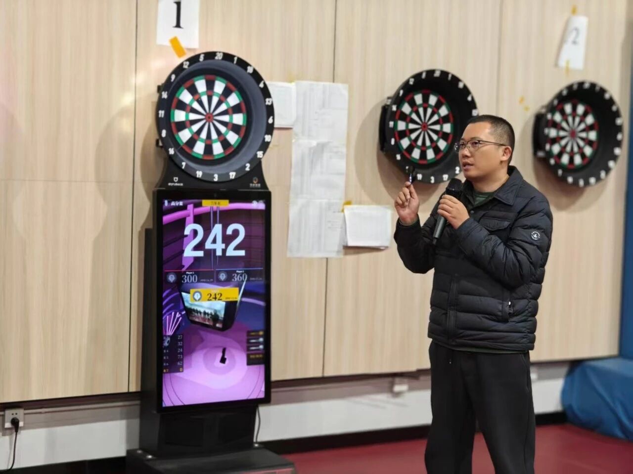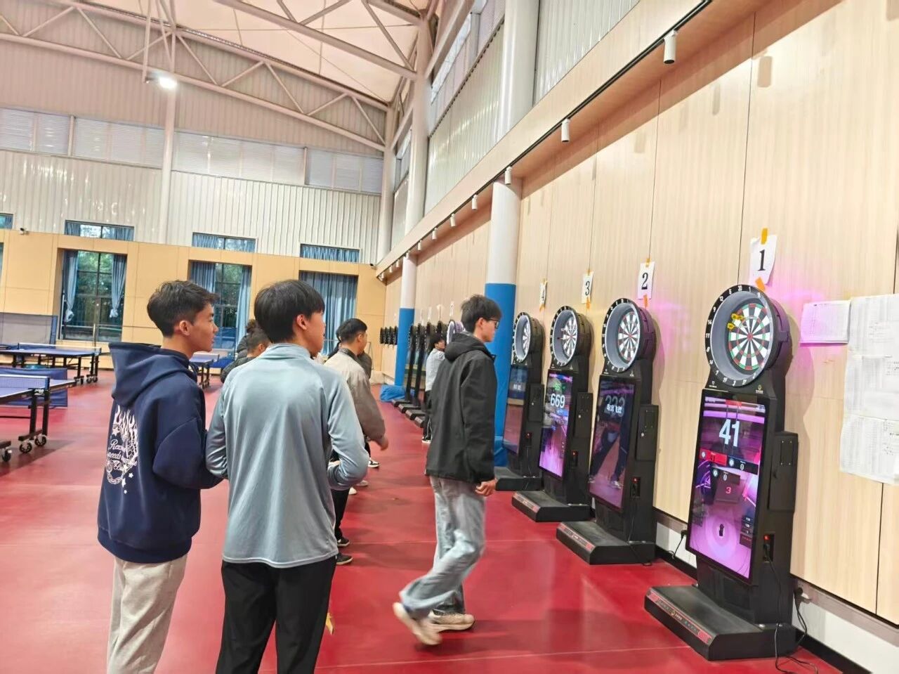 活动中,飞镖社指导老师刘老师为大家讲解了飞镖运动的基础知识,包括器材构成、计分规则以及握镖、站立、投掷等动作要领。讲解示范后,同学们纷纷上场体验。初次接触飞镖的羽毛球社员屏息凝神,专注投掷,逐渐掌握技巧;两社成员混合编组进行友谊赛,相互鼓励,交流心得,现场气氛热烈。