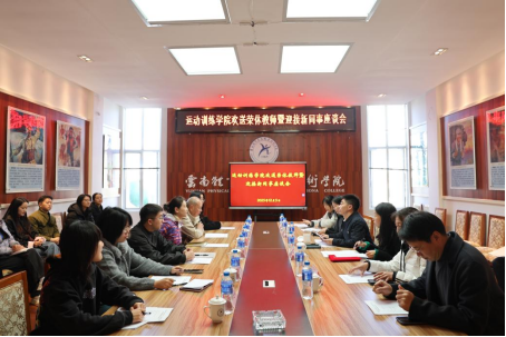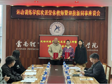 2025年12月5日上午,云南体育运动职业技术学院运动训练学院在综合楼二楼会议室隆重举行欢送荣休教师暨迎接新教师座谈会。尹西兰、杨栋2位荣休教师,4位新入职老师,人事处、工会负责人,运动训练学院领导班子成员、全体专兼职教师、学生代表,以及特邀教师齐聚一堂,共同见证这场承载感恩与希望、传承与创新的温情盛会。